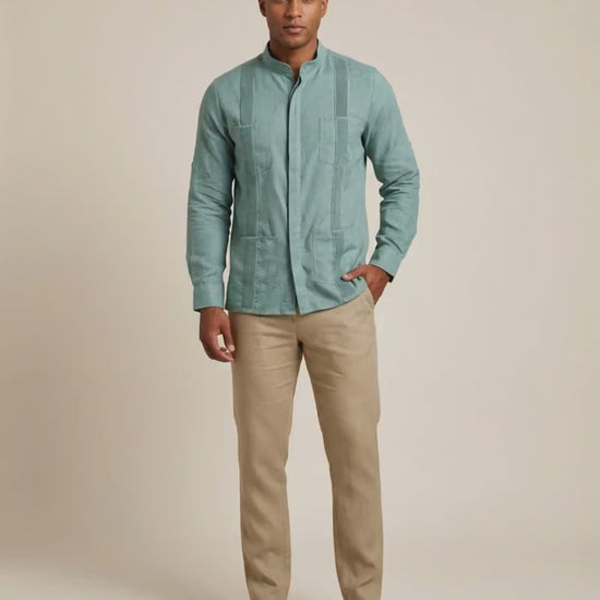 True style should feel as if it grew from the earth itself. The Agave Green Terra Guayabera is a color study in resilience and vitality. This specific, dusty verdant hue captures the spirit of the agave fields at dawn, while the subtle white flecks in our "Terra" weave mimic the plant’s natural fibers. It is a visual representation of a land that is both rugged and profoundly beautiful.