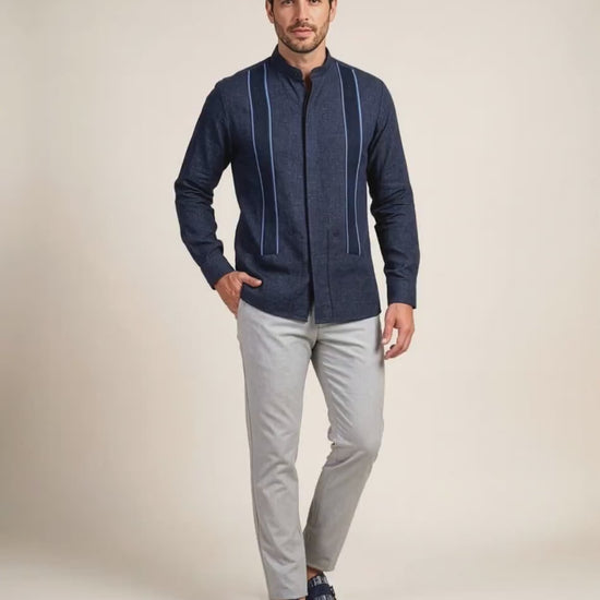 There is a specific elegance to the hour when the deep indigo sea at night meets the first hint of dawn. The Prism Blues Norteña Terra Guayabera captures this atmospheric transition. The Deep Navy Blue "Terra" canvas is introduced to sky blue accents that act like celestial anchors, providing a tactile complexity that is both grounding and ethereal.