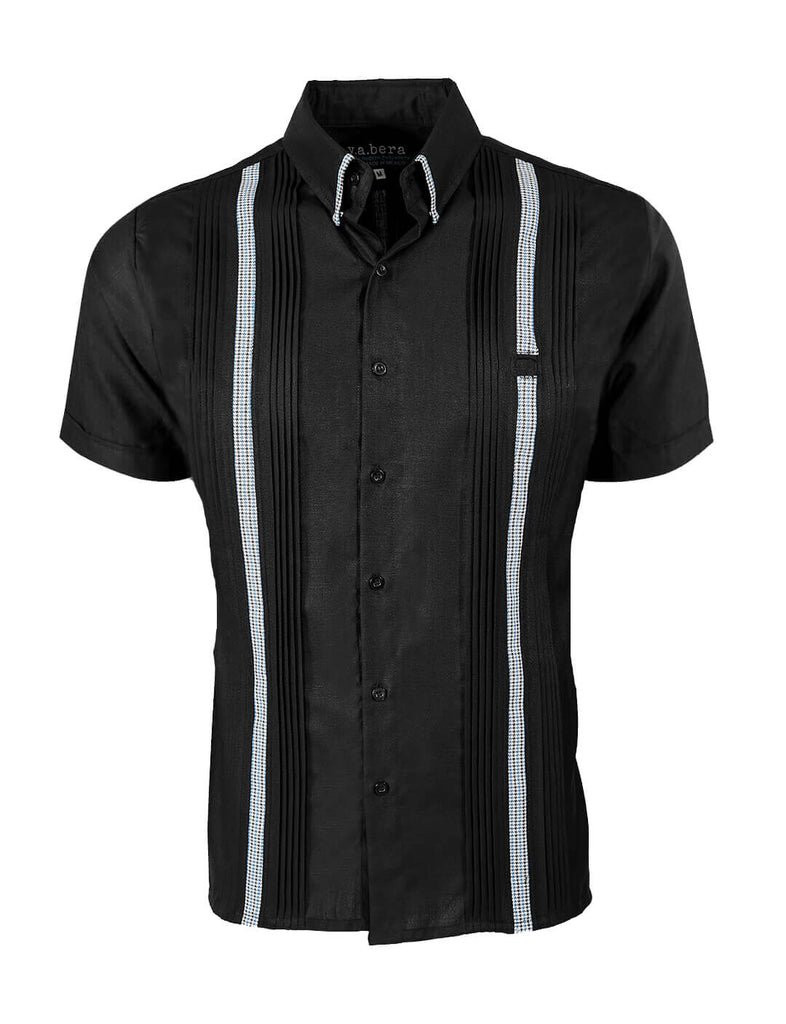 Man wearing a black short-sleeve guayabera shirt with buttons on a beige background