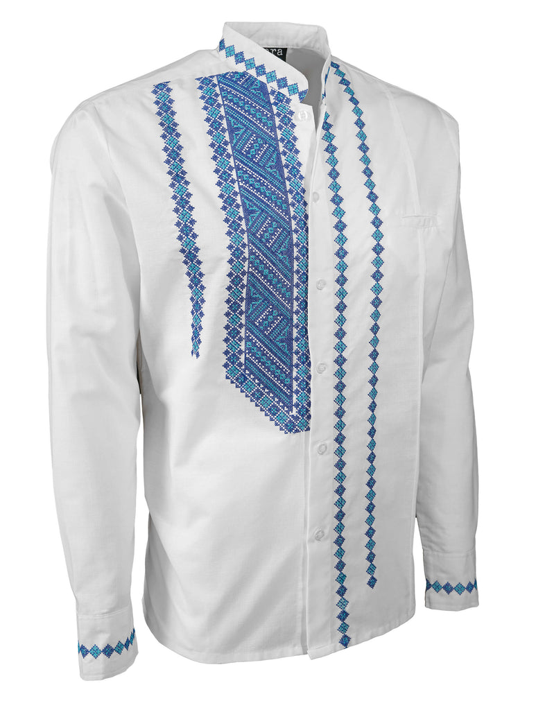 Man wearing a white embroidered guayabera shirt with blue patterns and black pants on a plain background