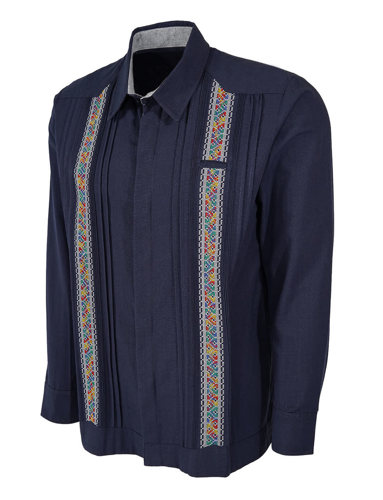 Introducing our unique Yucateco Collection, crafted in the traditional style of the Yucatán Peninsula. This collection features pieces made in Yucateño sizes that differ from our modern collection. Our Yucateco Navy Arcoíris Presidencial Guayabera is made from 100% Linen Navy Blue fabric and adorned with alternating pin-tuck pleats and five-color cross-stitch embroidery, all handcrafted to perfection. This exquisite guayabera shirt is an authentic piece that deserves a place in your wardrobe.